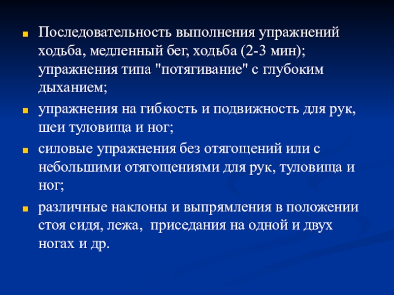 Слайд 9Последовательность выполнения упражнений ходьба, медленный бег, ходьба (2-3 мин);