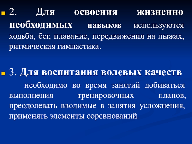 Слайд 222. Для освоения жизненно необходимых навыков используются ходьба, бег, плавание,