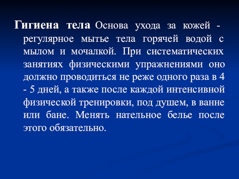 упражнениями оно должно проводиться не реже одного раза в 4 - 5 дней, а также после каждой интенсивной физической тренировки, под душем, в ванне или бане. Менять нательное белье после этого обязательно.