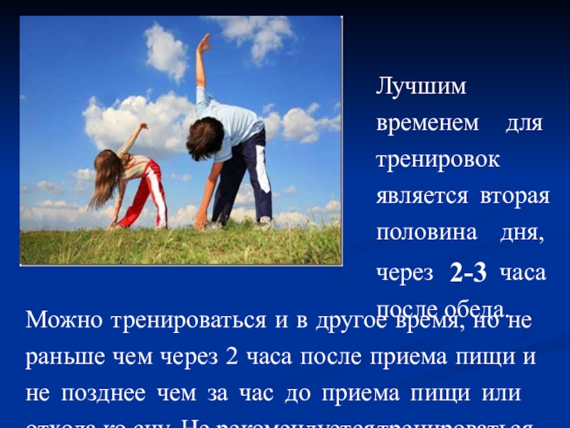 Слайд 15Лучшим временем для тренировок является вторая половина дня, через 2-3