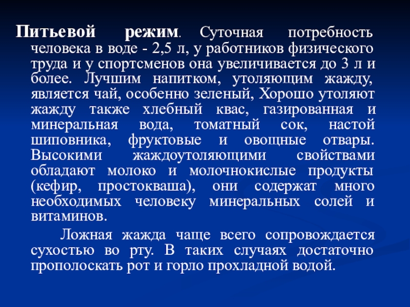 3 л и более. Лучшим напитком, утоляющим жажду, является чай, особенно зеленый, Хорошо утоляют жажду также хлебный квас, газированная и минеральная вода, томатный сок, настой шиповника, фруктовые и овощные отвары. Высокими жаждоутоляющими свойствами обладают молоко и молочнокислые продукты (кефир, простокваша), они содержат много необходимых человеку минеральных солей и витаминов.