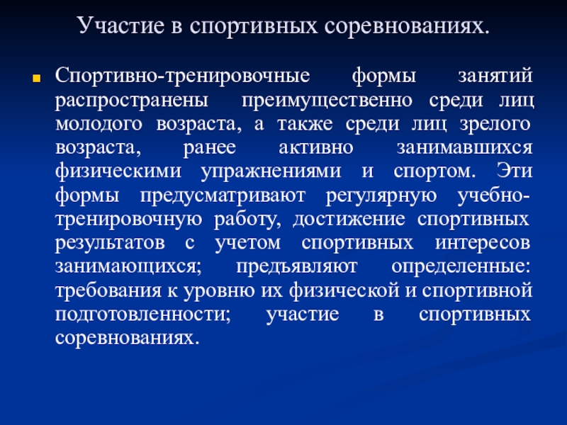 занимавшихся физическими упражнениями и спортом. Эти формы предусматривают регулярную учебно-тренировочную работу, достижение спортивных результатов с учетом спортивных интересов занимающихся; предъявляют определенные: требования к уровню их физической и спортивной подготовленности; участие в спортивных соревнованиях.