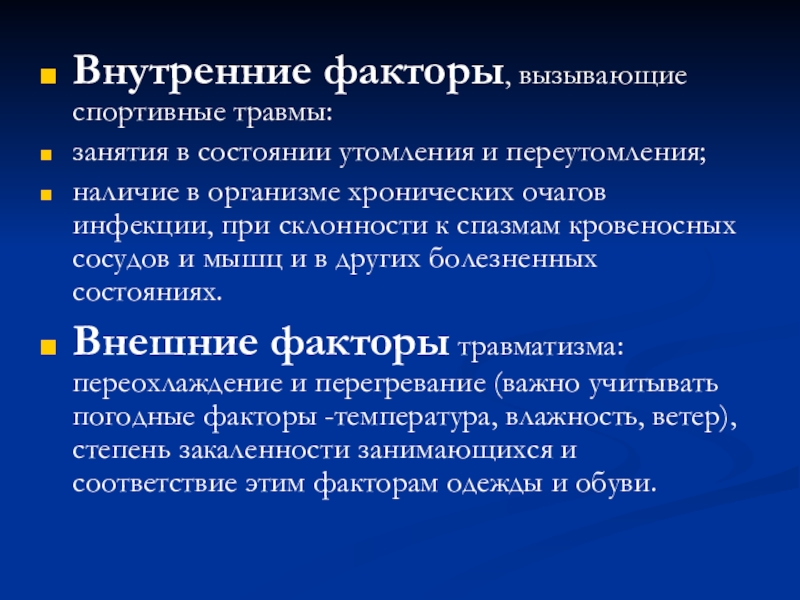 Слайд 60Внутренние факторы, вызывающие спортивные травмы: