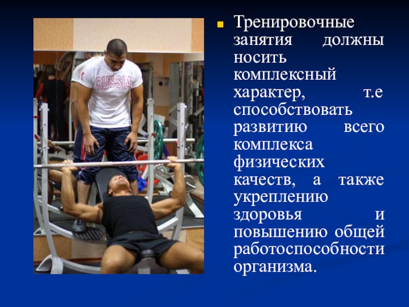 Слайд 16Тренировочные занятия должны носить комплексный характер, т.е способствовать развитию всего