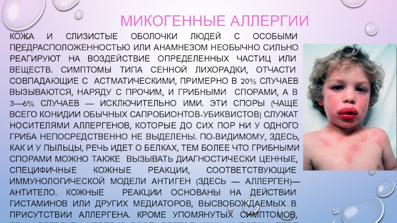 Полисахаридные – обусловливает клеточный иммунный ответ и развитие гиперчувствительности замедленного типа. Сенсибилизация организма грибами и проявление микозов всегда сопровождаются состоянием инфекционной аллергии, что позволяет использовать в диагностике этих заболеваний внутрикожные аллергические пробы с соответствующими аллергенами из грибов-возбудителей.