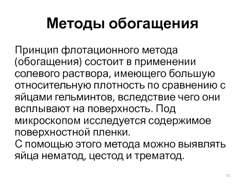 С помощью этого метода можно выявлять яйца нематод, цестод и трематод.