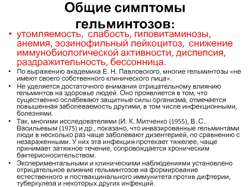 утомляемость, слабость, гиповитаминозы, анемия, эозинофильный лейкоцитоз, снижение