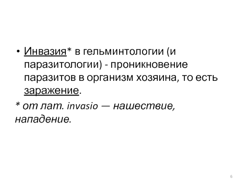 Слайд 6Инвазия* в гельминтологии (и паразитологии) - проникновение паразитов в организм