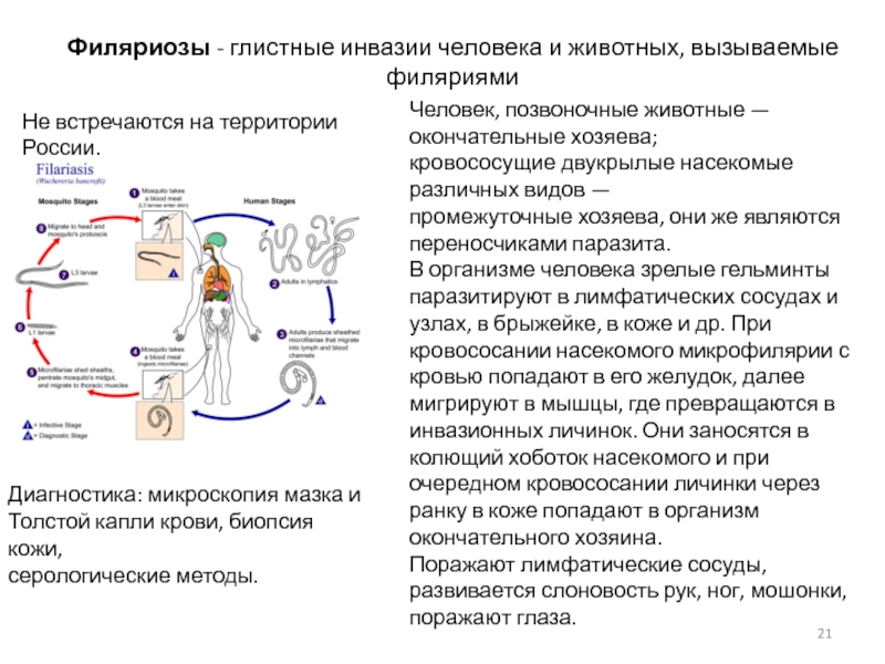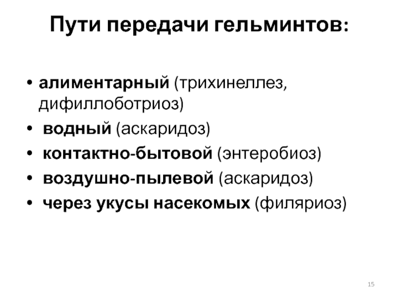 Следует указать также на возможность передачи гельминтов через укусы насекомых (филяриозы).