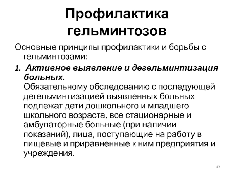 Обязательному обследованию с последующей дегельминтизацией выявленных больных подлежат дети дошкольного и младшего школьного возраста, все стационарные и амбулаторные больные (при наличии показаний), лица, поступающие на работу в пищевые и приравненные к ним предприятия и учреждения.