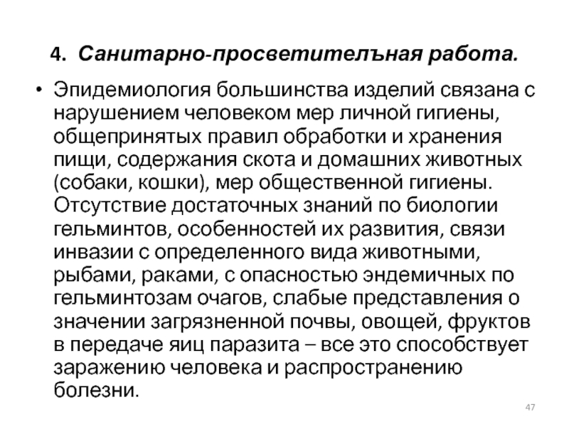 скота и домашних животных (собаки, кошки), мер общественной гигиены. Отсутствие достаточных знаний по биологии гельминтов, особенностей их развития, связи инвазии с определенного вида животными, рыбами, раками, с опасностью эндемичных по гельминтозам очагов, слабые представления о значении загрязненной почвы, овощей, фруктов в передаче яиц паразита – все это способствует заражению человека и распространению болезни.