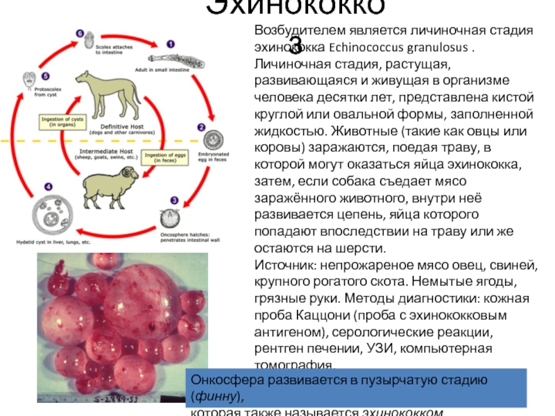 Источник: непрожареное мясо овец, свиней, крупного рогатого скота. Немытые ягоды, грязные руки. Методы диагностики: кожная проба Каццони (проба с эхинококковым антигеном), серологические реакции, рентген печении, УЗИ, компьютерная томография.