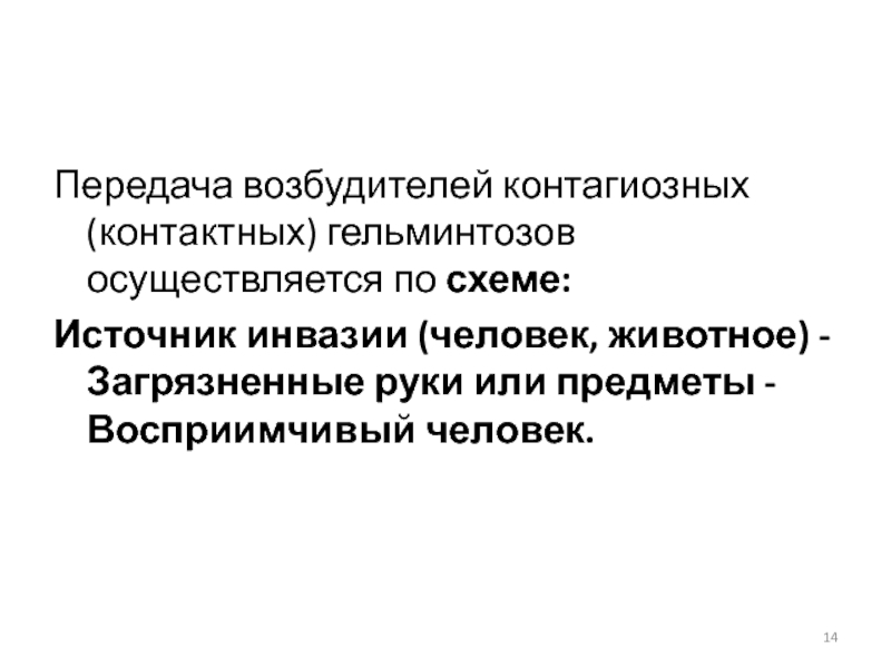 Слайд 14Передача возбудителей контагиозных (контактных) гельминтозов осуществляется по схеме: