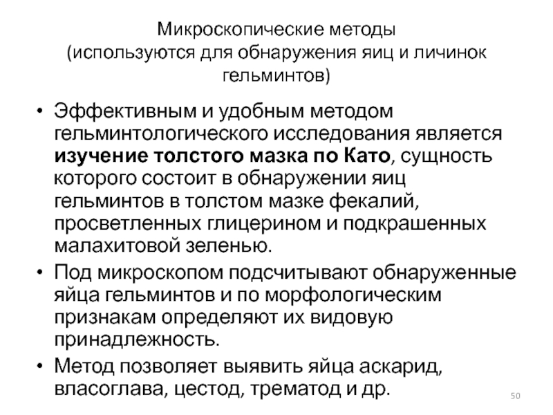 сущность которого состоит в обнаружении яиц гельминтов в толстом мазке фекалий, просветленных глицерином и подкрашенных малахитовой зеленью.