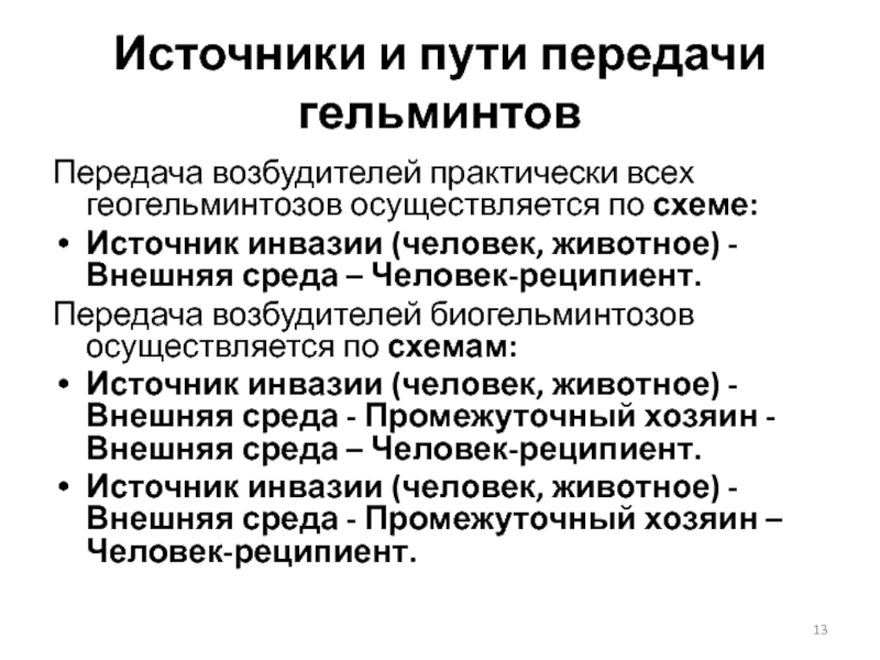 Источник инвазии (человек, животное) - Внешняя среда - Промежуточный хозяин - Внешняя среда – Человек-реципиент.