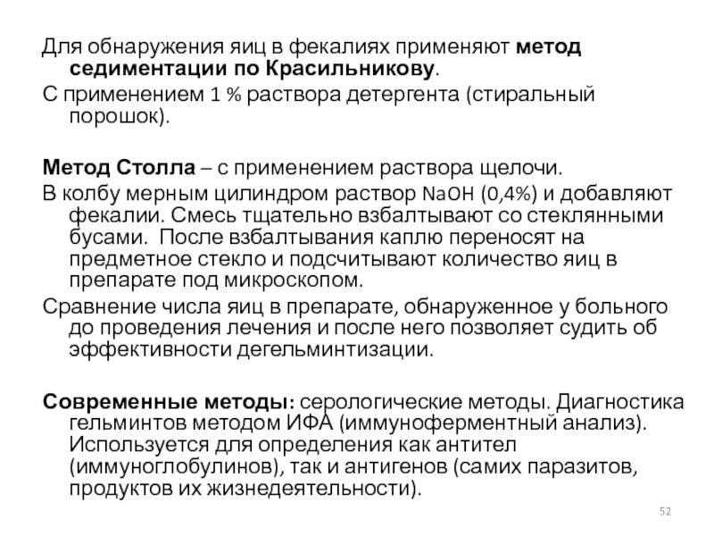 Слайд 52Для обнаружения яиц в фекалиях применяют метод седиментации по Красильникову.