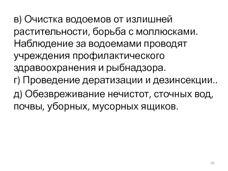 Слайд 45в) Очистка водоемов от излишней растительности, борьба с моллюсками. Наблюдение