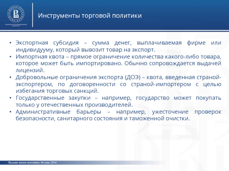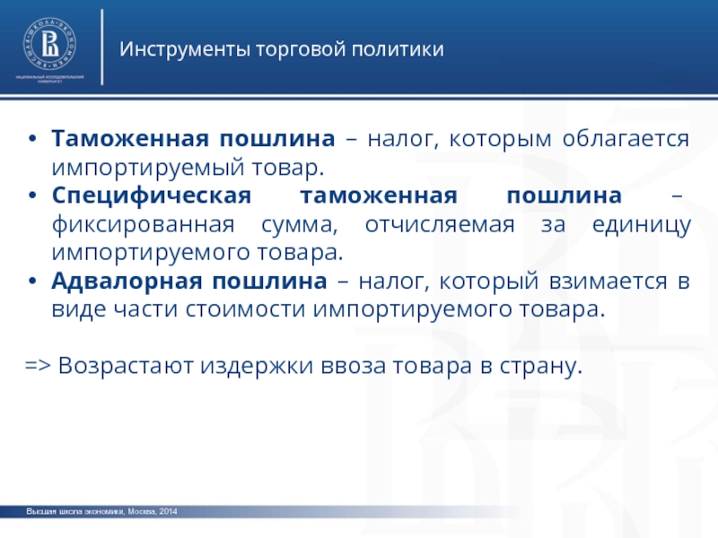 Высшая школа экономики, Москва, 2014Инструменты торговой политикиТаможенная пошлина – налог, которым облагается импортируемый товар.Специфическая таможенная пошлина – фиксированная сумма, отчисляемая за единицу импортируемого товара.Адвалорная пошлина – налог, который взимается в виде