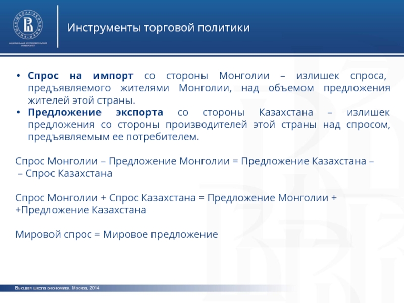 Высшая школа экономики, Москва, 2014Инструменты торговой политикиСпрос на импорт со стороны Монголии – излишек спроса, предъявляемого жителями