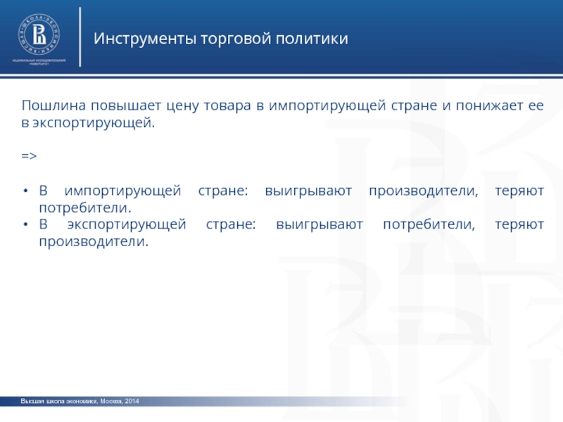 Высшая школа экономики, Москва, 2014Инструменты торговой политикиПошлина повышает цену товара в импортирующей стране и понижает ее в