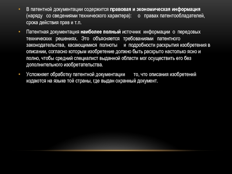 Патентная документация наиболее полный источник информации о передовых технических решениях. Это объясняется требованиями патентного законодательства, касающимися полноты и подробности раскрытия изобретения в описании, согласно которым изобретение должно быть раскрыто настолько ясно и полно, чтобы средний специалист выданной области мог осуществить его без дополнительного изобретательства.
