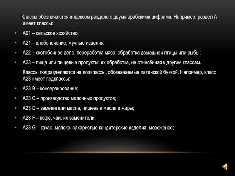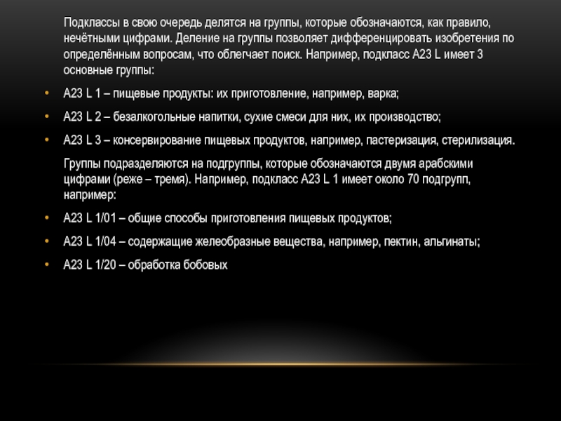 группы позволяет дифференцировать изобретения по определённым вопросам, что облегчает поиск. Например, подкласс A23 L имеет 3 основные группы:
