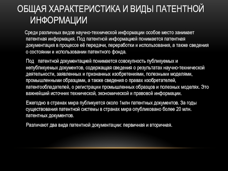 Ежегодно в странах мира публикуется около 1млн патентных документов. За годы существования патентной системы в странах мира опубликовано более 20 млн. патентных документов.