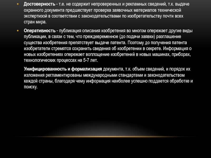Оперативность - публикация описания изобретения во многом опережает другие виды публикации, в связи с тем, что преждевременное (до подачи заявки) разглашение существа изобретения препятствует выдаче патента. Поэтому до получения патента изобретатели стремятся сохранить сведения об изобретении в секрете. Информация о новых изобретениях опережает воплощение изобретений в новых машинах, приборах, технологических процессах на 5-7 лет.