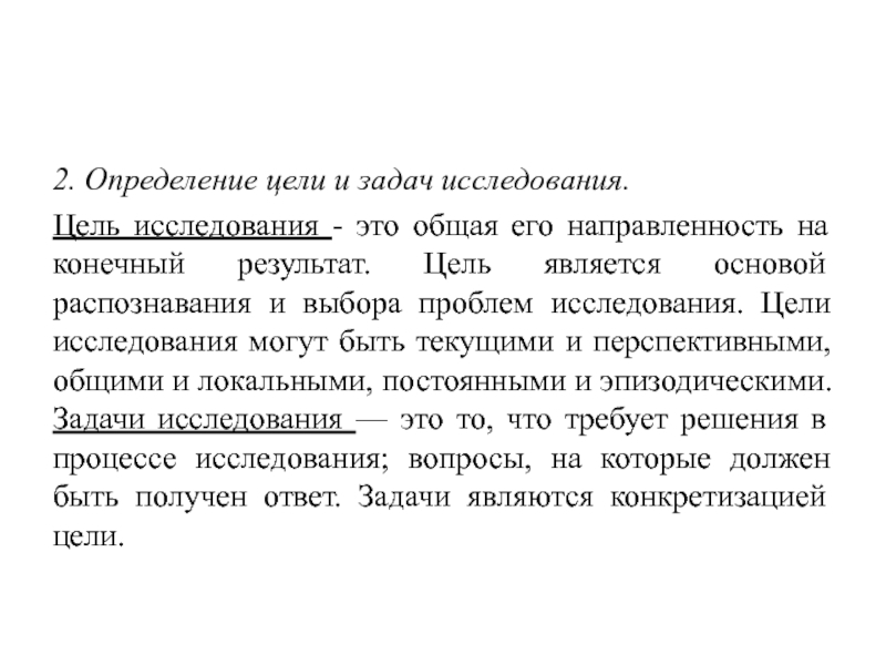 и выбора проблем исследования. Цели исследования могут быть текущими и перспективными, общими и локальными, постоянными и эпизодическими. Задачи исследования — это то, что требует решения в процессе исследования; вопросы, на которые должен быть получен ответ. Задачи являются конкретизацией цели.