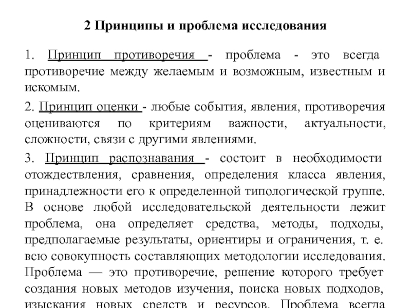 3. Принцип распознавания - состоит в необходимости отождествления, сравнения, определения класса явления, принадлежности его к определенной типологической группе. В основе любой исследовательской деятельности лежит проблема, она определяет средства, методы, подходы, предполагаемые результаты, ориентиры и ограничения, т. е. всю совокупность составляющих методологии исследования. Проблема — это противоречие, решение которого требует создания новых методов изучения, поиска новых подходов, изыскания новых средств и ресурсов. Проблема всегда характеризуется неопределенностью.