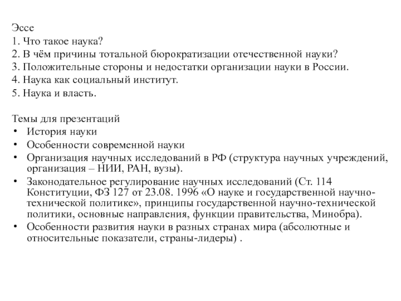 Законодательное регулирование научных исследований (Ст. 114 Конституции, ФЗ 127 от 23.08. 1996 «О науке и государственной научно-технической политике», принципы государственной научно-технической политики, основные направления, функции правительства, Минобра).
