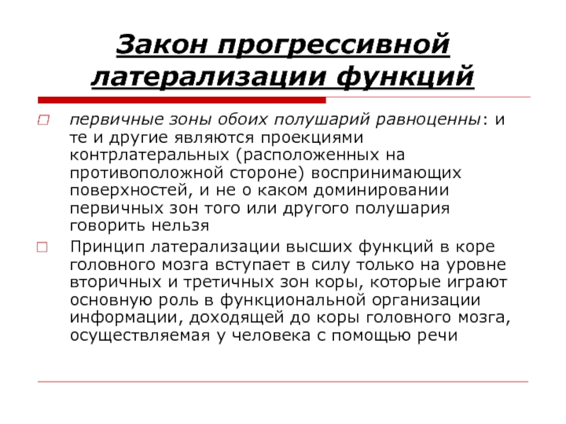 Принцип латерализации высших функций в коре головного мозга вступает в силу только на уровне вторичных и третичных зон коры, которые играют основную роль в функциональной организации информации, доходящей до коры головного мозга, осуществляемая у человека с помощью речи