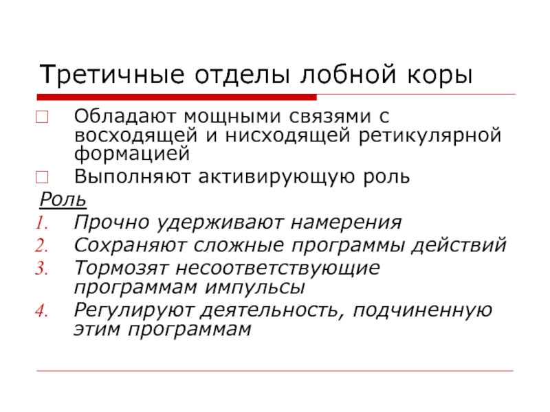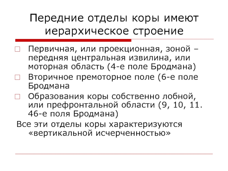 Слайд 24Передние отделы коры имеют иерархическое строение