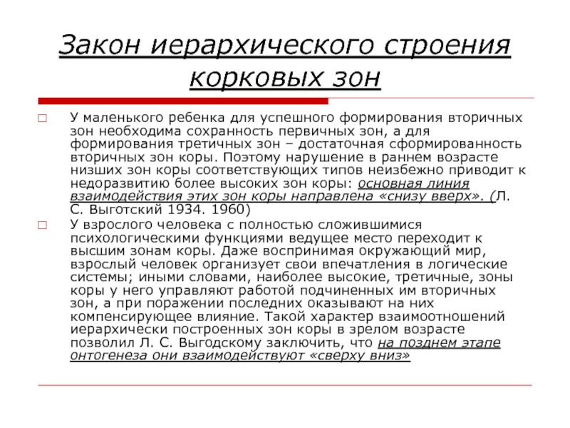 У взрослого человека с полностью сложившимися психологическими функциями ведущее место переходит к высшим зонам коры. Даже воспринимая окружающий мир, взрослый человек организует свои впечатления в логические системы; иными словами, наиболее высокие, третичные, зоны коры у него управляют работой подчиненных им вторичных зон, а при поражении последних оказывают на них компенсирующее влияние. Такой характер взаимоотношений иерархически построенных зон коры в зрелом возрасте позволил Л. С. Выгодскому заключить, что на позднем этапе онтогенеза они взаимодействуют «сверху вниз»