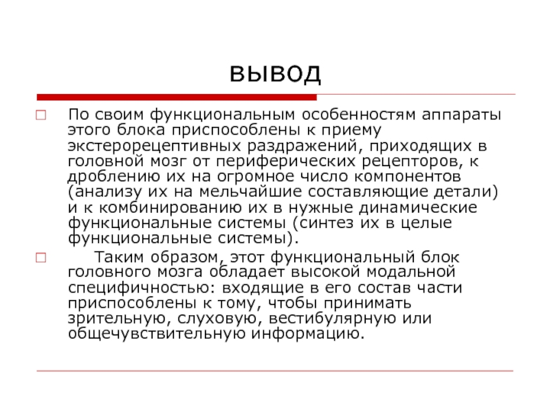 Таким образом, этот функциональный блок головного мозга обладает высокой модальной специфичностью: входящие в его состав части приспособлены к тому, чтобы принимать зрительную, слуховую, вестибулярную или общечувствительную информацию.