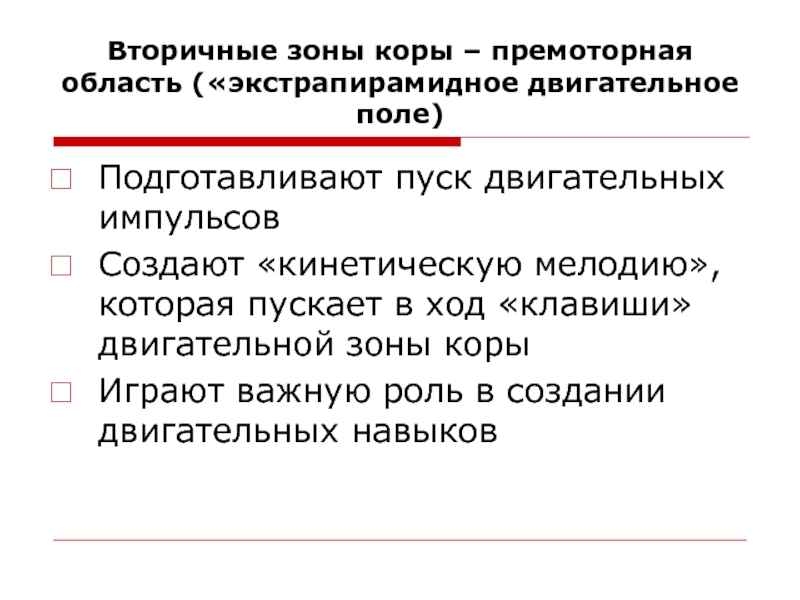 Слайд 26Вторичные зоны коры – премоторная область («экстрапирамидное двигательное поле)