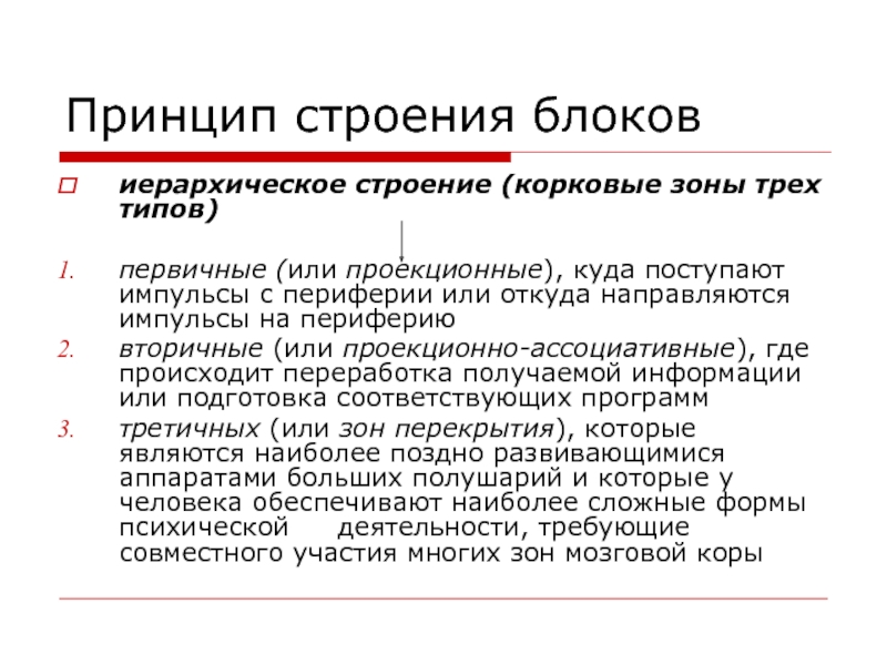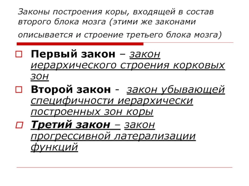 Слайд 18Законы построения коры, входящей в состав второго блока мозга (этими