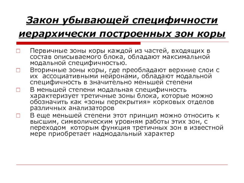 Слайд 20Закон убывающей специфичности иерархически построенных зон коры