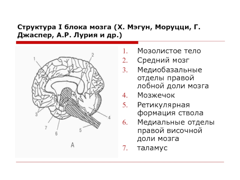 Слайд 9Структура I блока мозга (Х. Мэгун, Моруцци, Г. Джаспер, А.Р.