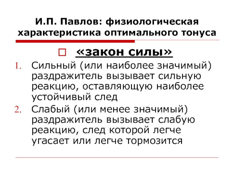 Слайд 8И.П. Павлов: физиологическая характеристика оптимального тонуса