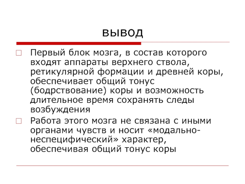 Работа этого мозга не связана с иными органами чувств и носит «модально-неспецифический» характер, обеспечивая общий тонус коры