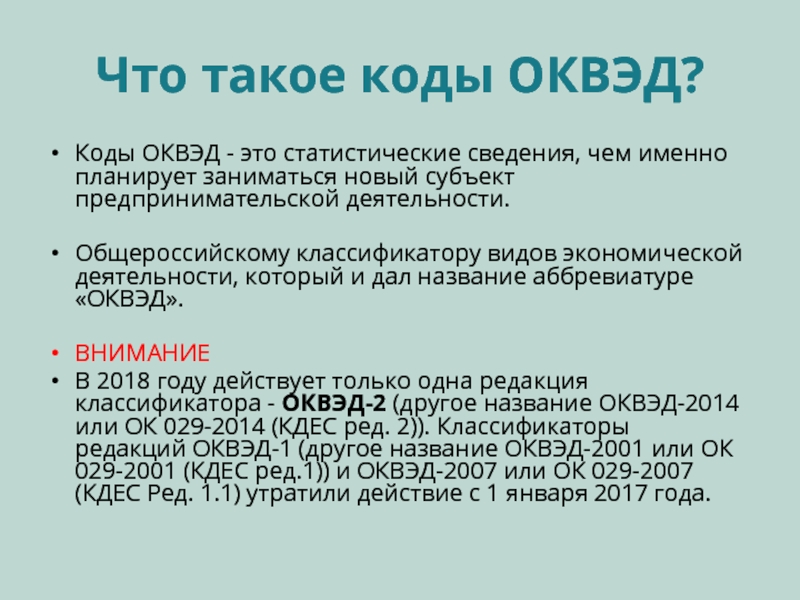 В 2018 году действует только одна редакция классификатора - ОКВЭД-2 (другое название ОКВЭД-2014 или ОК 029-2014 (КДЕС ред. 2)). Классификаторы редакций ОКВЭД-1 (другое название ОКВЭД-2001 или ОК 029-2001 (КДЕС ред.1)) и ОКВЭД-2007 или ОК 029-2007 (КДЕС Ред. 1.1) утратили действие с 1 января 2017 года.