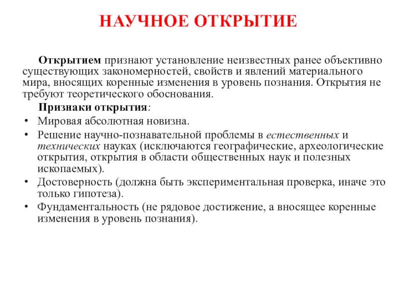 Открытием признают установление неизвестных ранее объективно существующих закономерностей, свойств