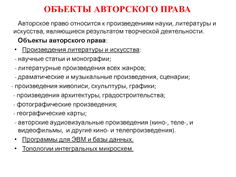 интеллектуальной собственности обычно относят права, касающиеся объектов следующих основных категорий: