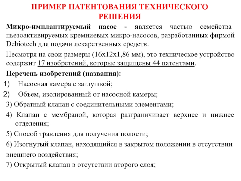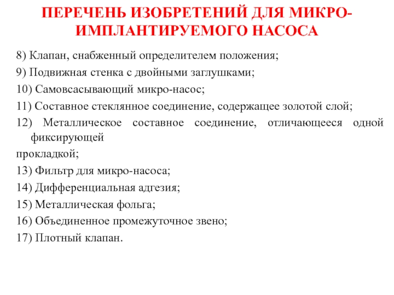 ПЕРЕЧЕНЬ ИЗОБРЕТЕНИЙ ДЛЯ МИКРО-ИМПЛАНТИРУЕМОГО НАСОСА