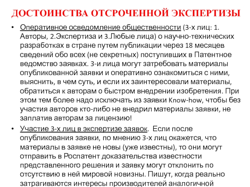 18 месяцев сведений обо всех (не секретных) поступивших в Патентное ведомство заявках. 3-и лица могут затребовать материалы опубликованной заявки и оперативно ознакомиться с ними, выяснить, в чем суть, и если их заинтересовали материалы, обратиться к авторам о быстром внедрении изобретения. При этом тем более надо исключать из заявки Know-how, чтобы без участия авторов кто-либо не внедрил материалы заявки, не заплатив авторам за лицензию!
