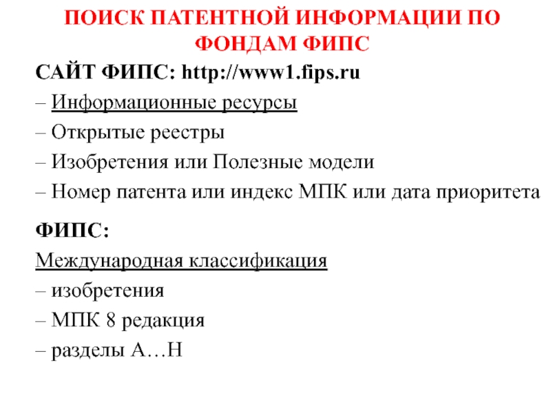 Слайд 46ПОИСК ПАТЕНТНОЙ ИНФОРМАЦИИ ПО ФОНДАМ ФИПС