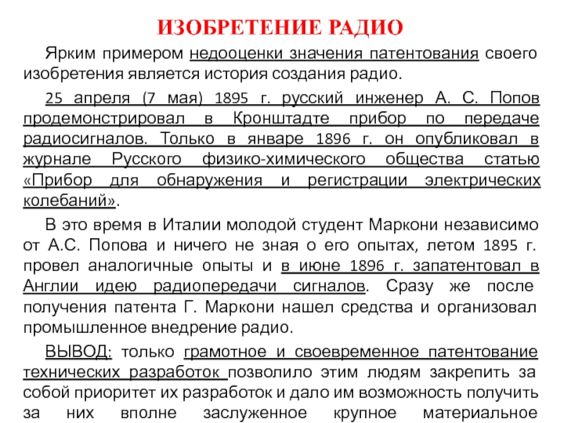 В это время в Италии молодой студент Маркони независимо от А.С. Попова и ничего не зная о его опытах, летом 1895 г. провел аналогичные опыты и в июне 1896 г. запатентовал в Англии идею радиопередачи сигналов. Сразу же после получения патента Г. Маркони нашел средства и организовал промышленное внедрение радио.