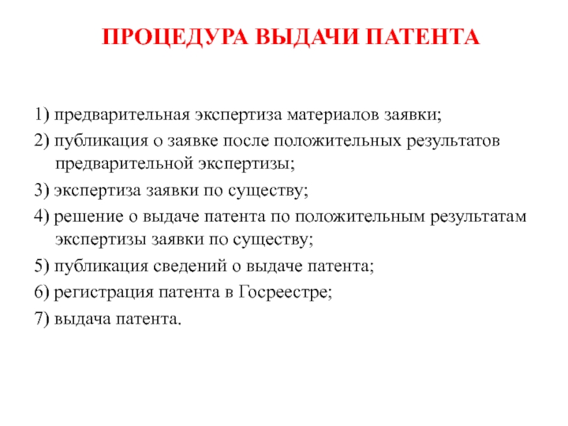 Слайд 39ПРОЦЕДУРА ВЫДАЧИ ПАТЕНТА