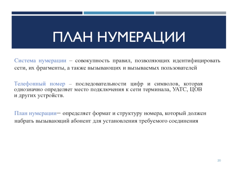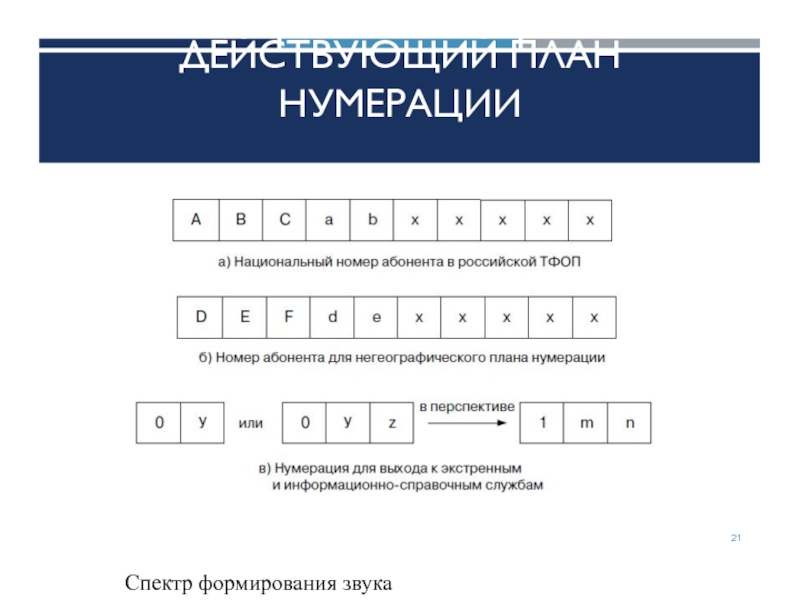 План нумерации– определяет формат и структуру номера, который должен набрать вызывающий абонент для установления требуемого соединения